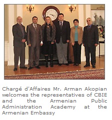The visit of the Armenian delegation was part of the collaboration between the CBIE and the Armenian Public Administration Academy aimed at the establishment of a specialization program in Public Policy Analysis for the Academy’s Master’s program in Public Administration. This process has taken place under the auspices of the Public Policy Knowledge Network Project (PPKN) South Caucasus funded by the Canadian International Development Agency (CIDA) and the Local Government and Public Service Reform Initiative-Budapest of the Open Society Institute.