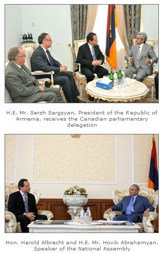 The Canadian Parliamentarians met with H.E. Mr. Serzh Sargsyan, President of the Republic of Armenia, H.E. Mr. Hovik Abrahamyan, Speaker of the National Assembly, H.E. Mr. Tigran Sargsyan, Prime Minister, H.E. Mr. Edward Nalbandian, Minister of Foreign Affairs, and Mr. Gagik Beglaryan, Mayor of the City of Yerevan. At the National Assembly Canadian Parliamentarians also met with their colleagues from the Armenia-Canada Parliamentary Friendship group.